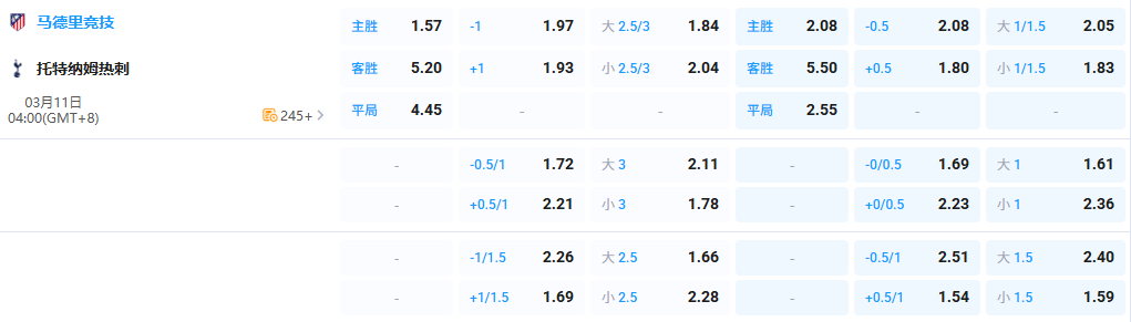 数据初盘开出主队-1,说明对马德里竞技实力的认可。马德里竞技本赛季最引人注目的标签不再是枯燥的防守反击,而是西蒙尼式的暴力美学。阵型的大胆调整,更强调前场逼抢和中路渗透。让其在欧冠赛场场均进球高达2.1。瑟洛特与格里兹曼的高效联动,是马竞转型的底气。反观热刺虽曾在小组赛有过亮眼表现,但进入26年后球队仿佛被施加了魔咒。联赛多场不胜,新帅上任后也试图摆脱保级泥潭,但伤病潮和体能瓶颈未能如愿。战术执行力崩塌,且缺乏信心。综合分析本场看好马德里竞技取胜。