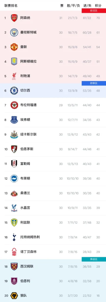 英超 联赛进入第30轮,争冠格局逐渐明朗,阿森纳本轮主场2-0战胜埃弗顿,积70分稳居榜首,领先曼城9分,进一步巩固了冠军优势。曼城本轮1-1战平西汉姆联,追赶压力骤增。与此同时,曼联凭借3-1战胜维拉稳固了第三位,目前积54分。