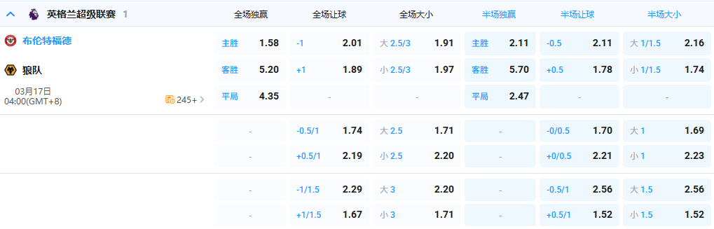 【4点整 英超 布伦特福德 vs 狼队】