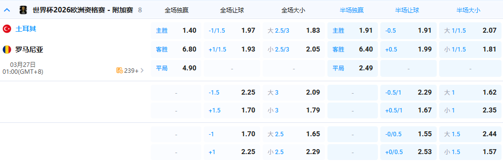 - 全场让球:土耳其 -1/1.5@1.97