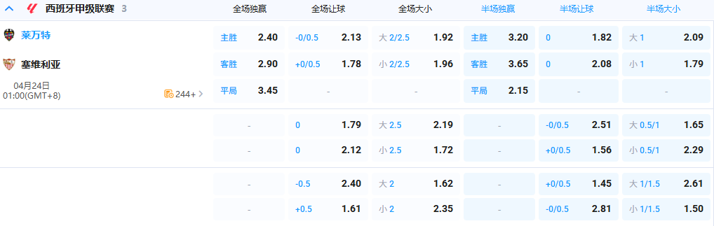 - 全场让球:莱万特 -0/0.5 @ 2.13