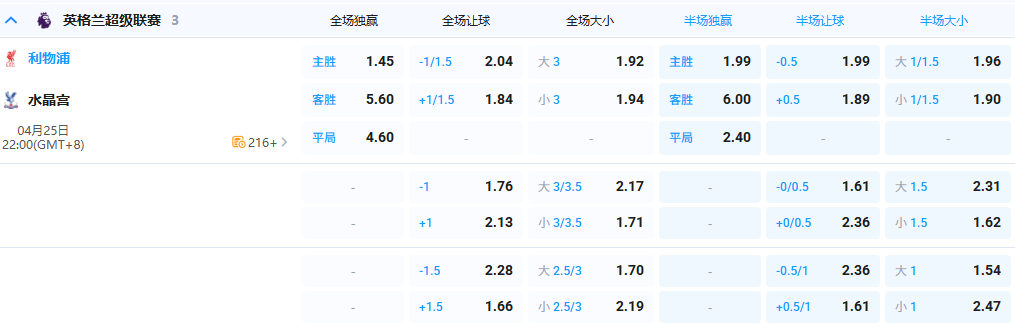 • 全场让球:水晶宫 +1/1.5 @ 1.84