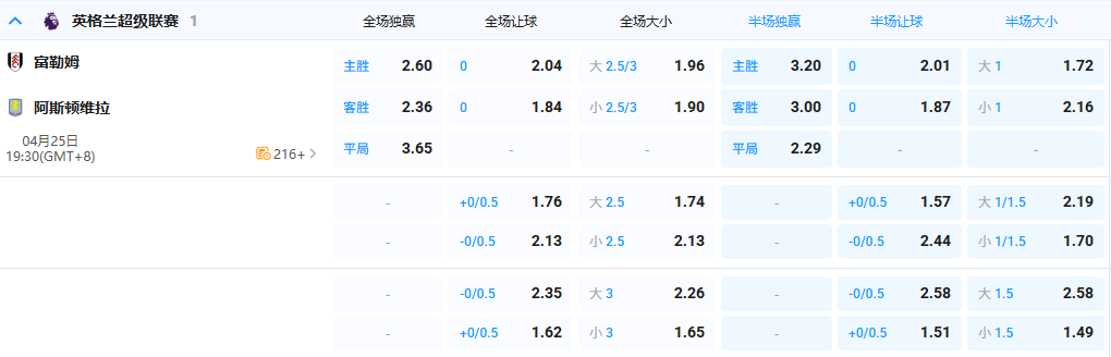 【19点30分 英超 富勒姆 vs 阿斯顿维拉】