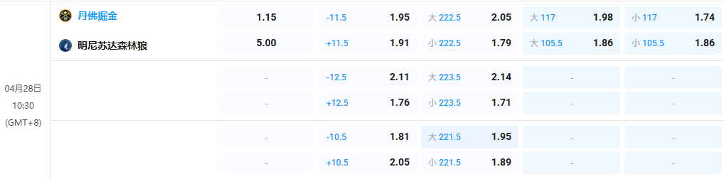 • 全场让分:丹佛掘金 -11.5 @ 1.95