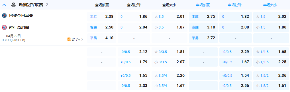 数据初盘开出主队 -0/0.5,说明对巴黎圣日耳曼主场优势的倾斜。巴黎圣日耳曼本赛季在欧战赛场防守极其稳固,近两场对阵利物浦均完成零封。主教练对中场控制力的提升效果显著。新体系下巴黎更加强调团队协作,但关键时刻的爆发力依然依赖于目前队内的顶级边锋群。反观拜仁慕尼黑在四分之一决赛中经历了本赛季欧冠最惨烈的战斗。捅破天式的战术,得益于拜仁实力雄厚锋群。凯恩和穆西亚拉的连线本赛季已在欧冠合力制造了超过2位数的进球。综合分析拜仁本赛季曾在王子公园球场带走过胜利,心里占据一定优势。本场看好拜仁慕尼黑取胜。